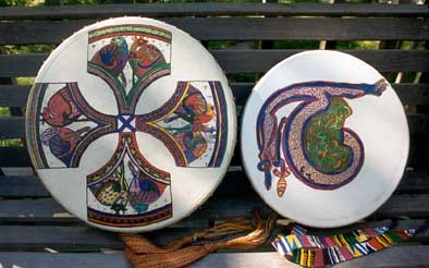 The bodhran on the left is made by "Moggy" Marc "Mog" Moggy, of Renegade Rhythms Bodhráns in England. The bodhran on the right is made by Fred Halpin, of Gloucester, Ontario, Canada. Listen to Jane play both drums on the intro to Rise Again on the Thistledown Thunder CD. To learn more about the instrument, go to the Bodhran Home Page.